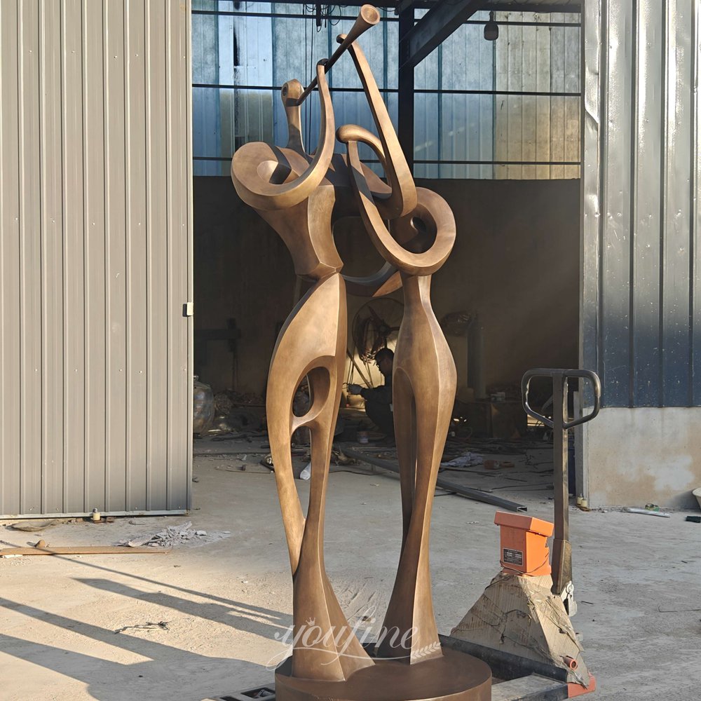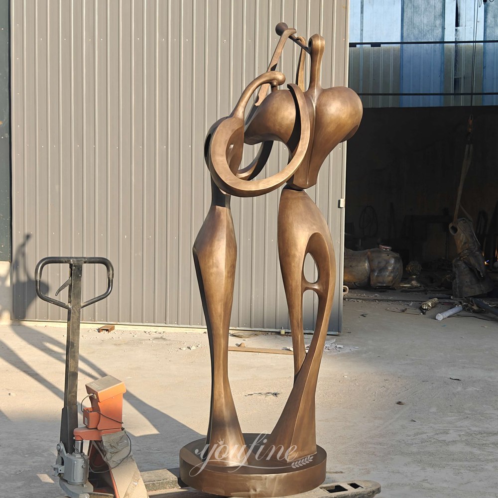 The bronze abstract lovers sculpture shows two lovers hugging and playing the flute in an abstract style, featuring smooth lines and balanced proportions.