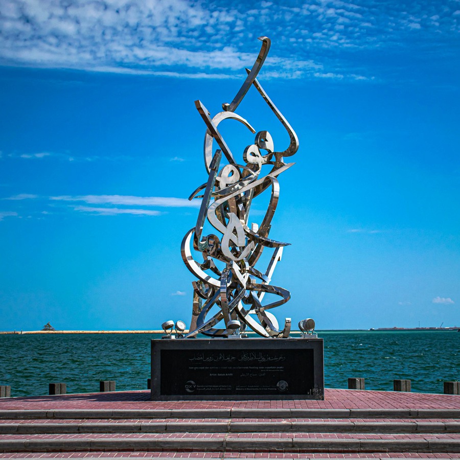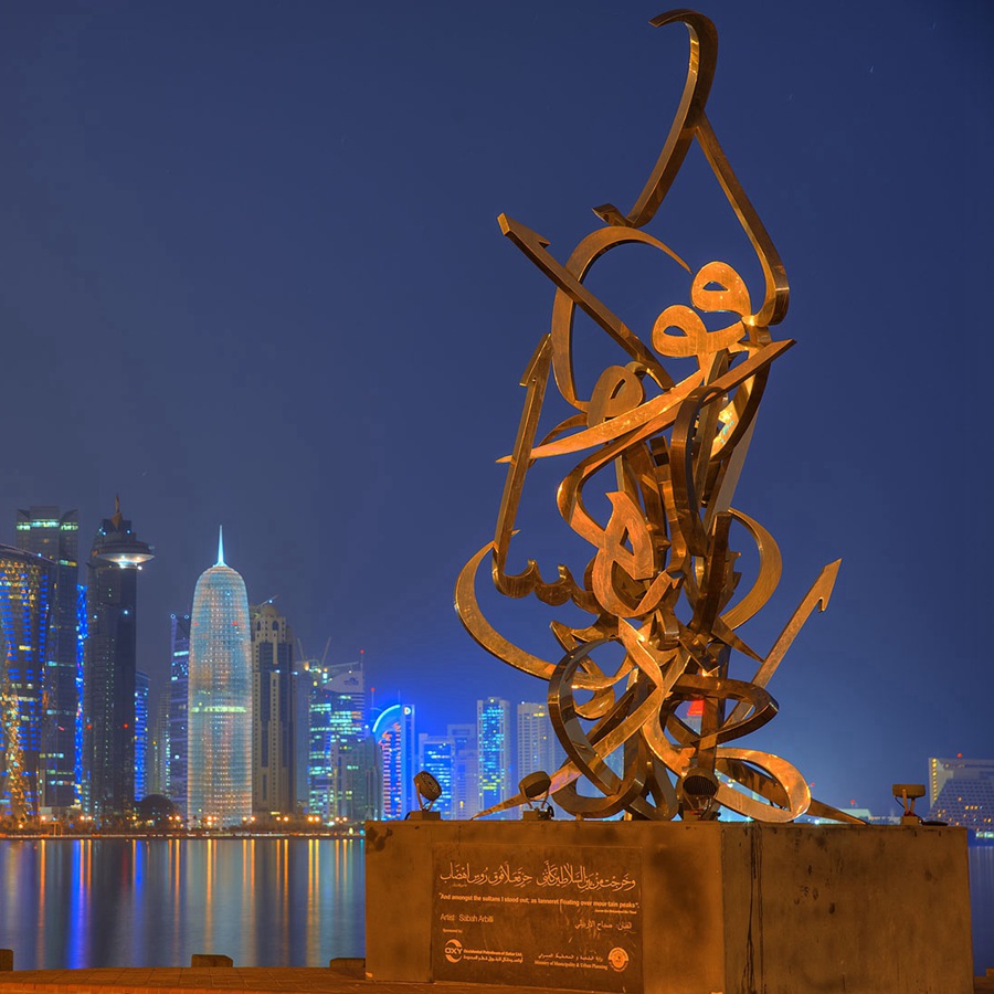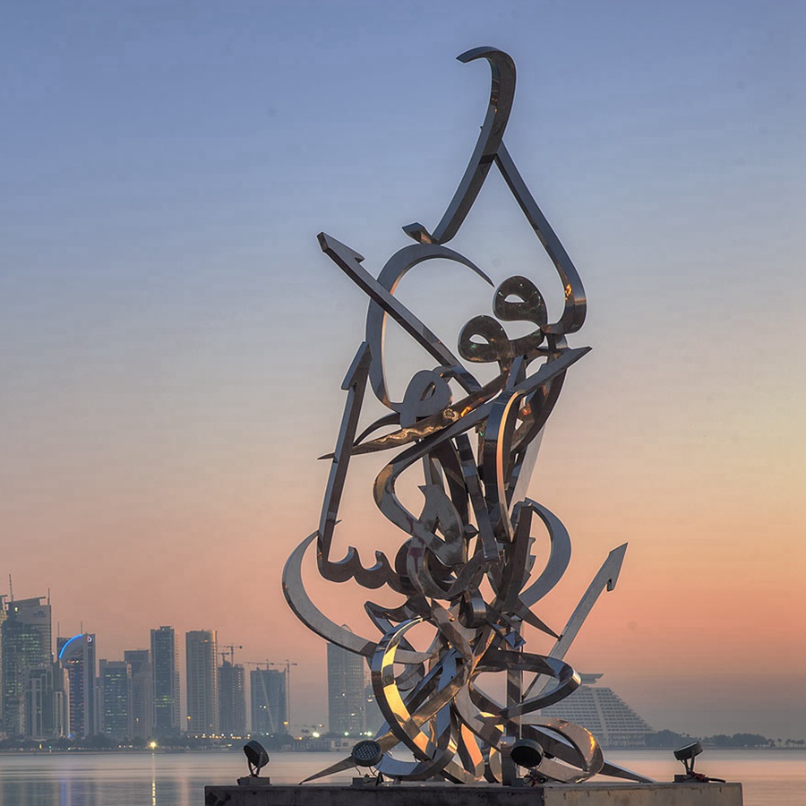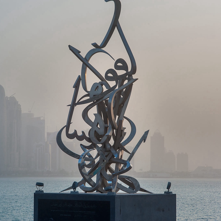 The original Arabic calligraphy sculpture is located on the Corniche in Doha, Qatar. British calligrapher Sabah Al-Bili was inspired by a poem by Qatar’s founding father, His Highness Sheikh Jassim bin Mohammed Al-Thani.