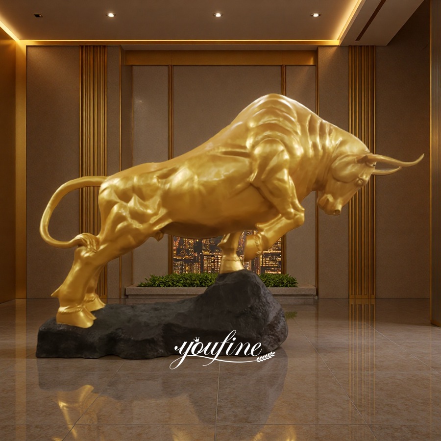 This bronze golden bull statue features a vivid and powerful form. It boasts a uniform color, an elegant, and luxurious feel. The surface is treated with wax or varnish to isolate it from water and oxygen, enhancing the sculpture’s corrosion resistance.