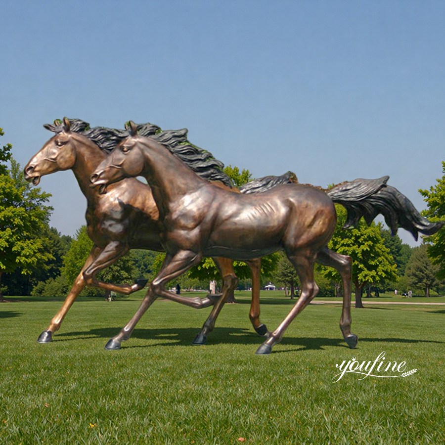 Our bronze horse sculptures are customizable. While these are typically galloping, they can also be created in various poses or with combinations of different horse breeds. Shown below are some custom-made running horse sculptures. Their brown exterior and dynamic postures create a majestic atmosphere.