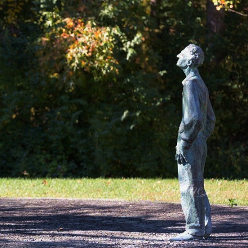 The figure in the sculpture is wearing a shirt and trousers, with short hair. His hands are touching the pockets beside his trousers, looking up at the camel in front of him.