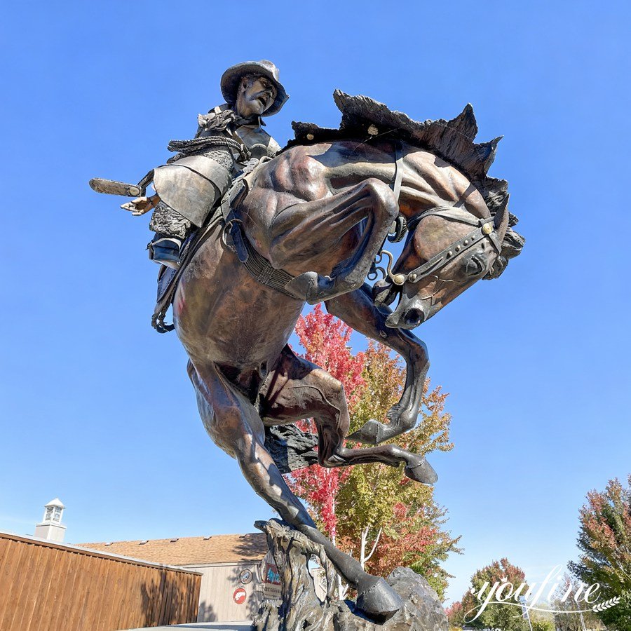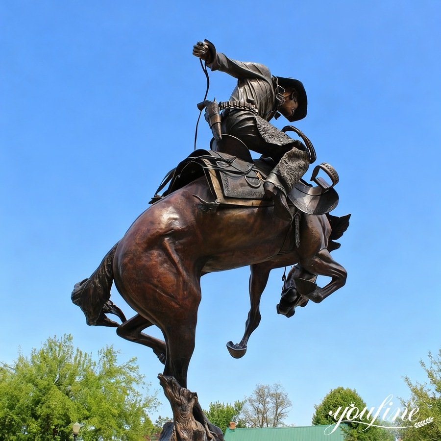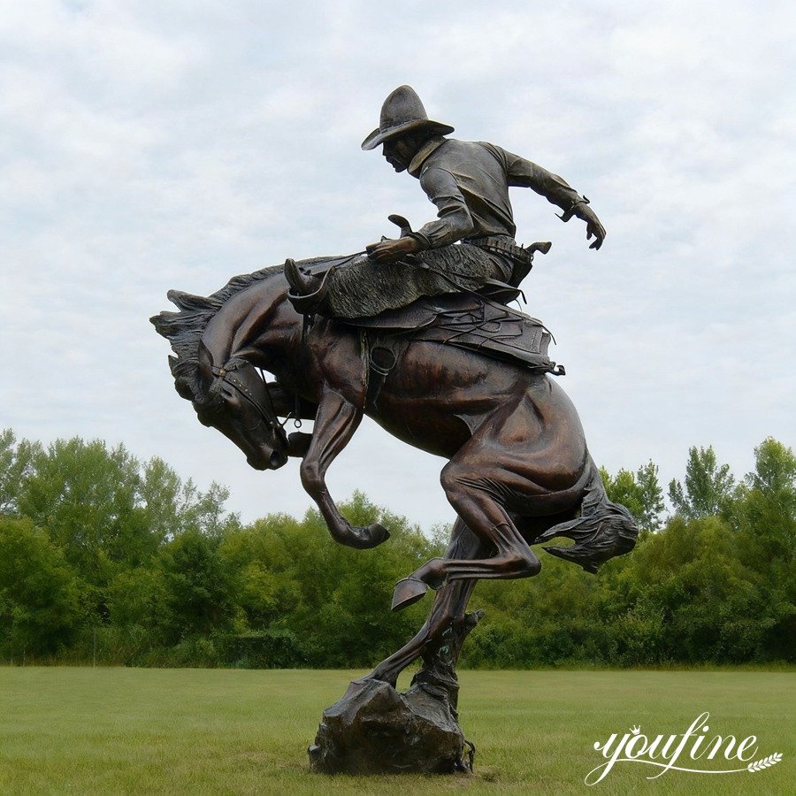 The sculpture depicts a cowboy on horseback, the horse in a vigorous, prancing stance, and the horse’s facial expression is vivid, conveying a frenzied and struggling state. The cowboy wears a wide-brimmed hat, one arm extended backward, the other holding the reins.