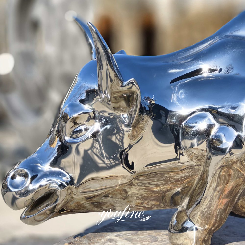 This metal bull sculpture is made of high-quality, corrosion-resistant, and oxidation-resistant stainless steel, perfectly replicating the appearance of the Wall Street bull, showcasing a unique sculptural style in stainless steel.