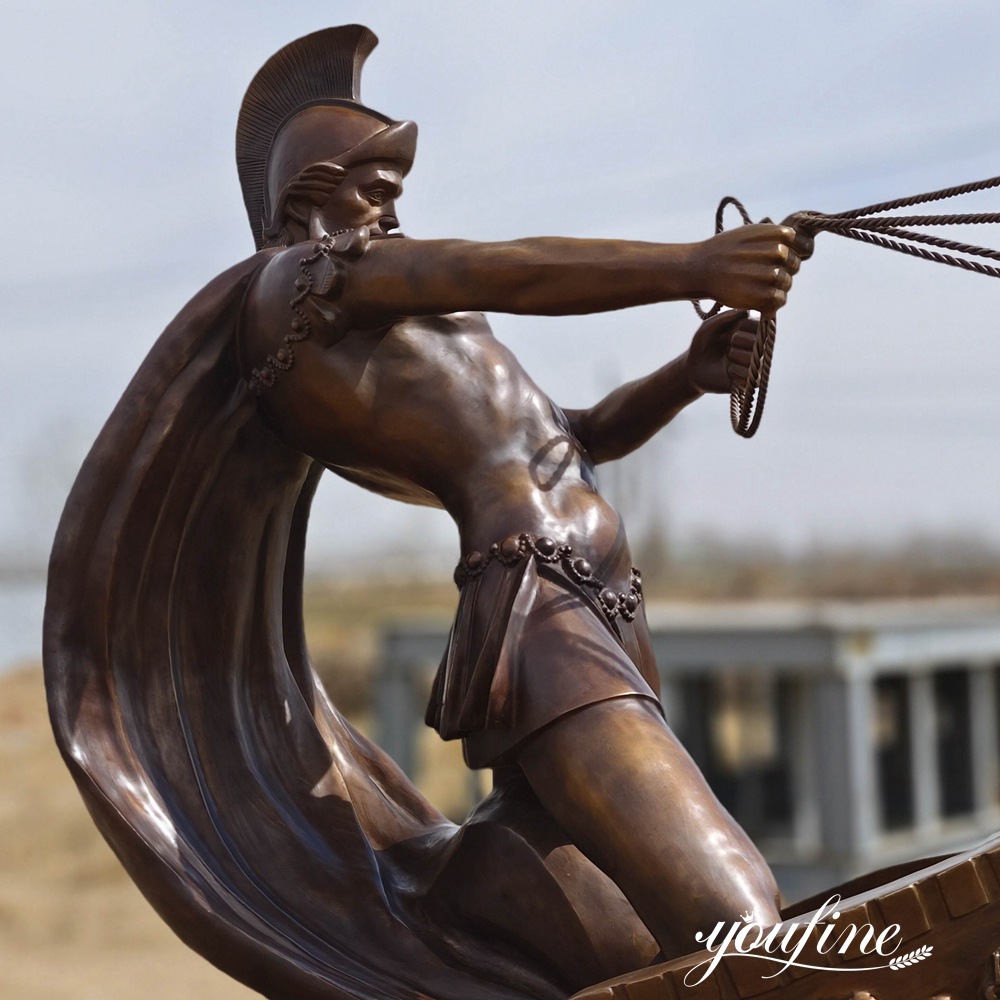 The sculpture depicts a warrior wearing a helmet and armor, standing on a chariot, holding the reins with both hands, his cape arched behind him.