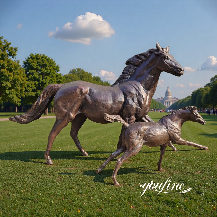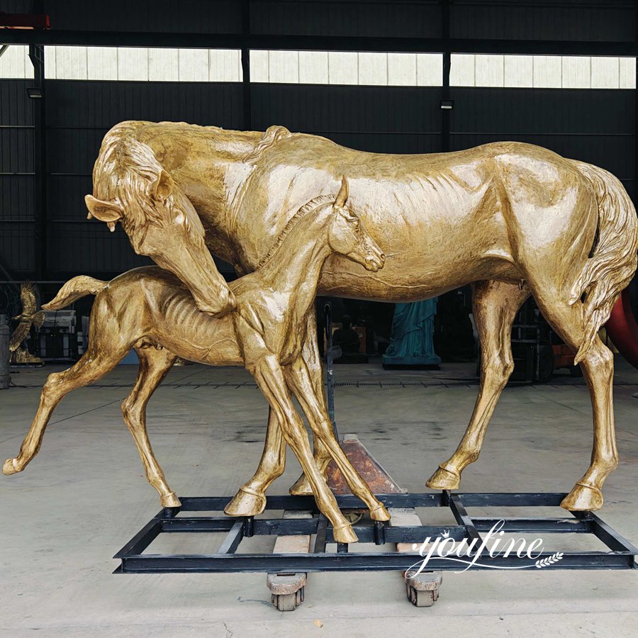 This life-size bronze mare and foal statue is one of YouFine Factory’s most popular styles. The mare and young foal stand one after the other, creating a heartwarming scene.