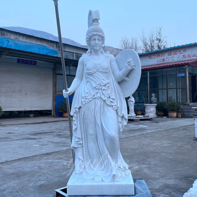 In art, the Greek goddess Athena is often depicted holding a spear and shield, appearing as a warrior in mind. Considering the feature, we especially use a combination of high-quality natural marble and high-quality bronze to create. Athena’s body, including her clothes, is finely carved by artists using pure natural marble. The lines of muscles, the folds of the dress, and the emaciated face are all very fine. The spear and shield are made of bronze, more in line with the characteristics of war.