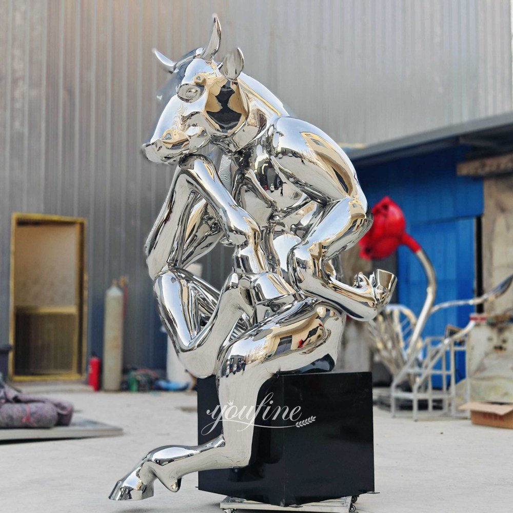The stainless steel Barcelona bull statue is unique in that it mimics the pose of Rodin’s classic sculpture “The Thinker,” cleverly anthropomorphizing the bull.