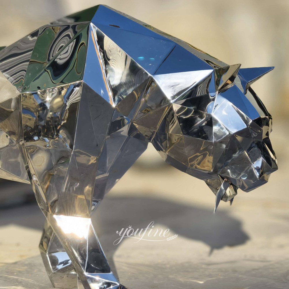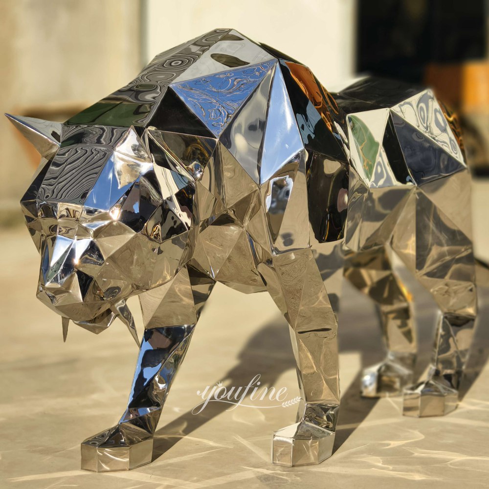 This is a stainless steel saber-tooth tiger statue in a walking pose. The surface is treated with a high-polish finish, resulting in a mirror-like smoothness, and its luster changes with varying light conditions.