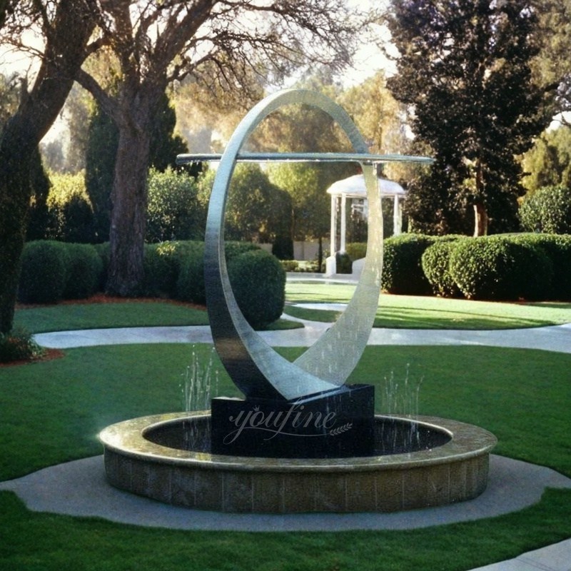 This large metal outdoor fountain features two interlaced rings, a matte surface with a black base, and a top ring added to the middle ring, creating a visual effect of water flowing from all sides. Whether placed in an outdoor garden, large square, shopping mall, or hotel, this stainless steel water feature will be very harmoniously integrated.