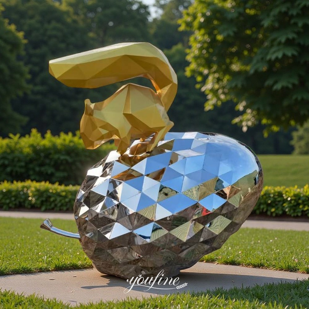 This unique stainless steel sculpture features a cute squirrel perched on an acorn, combining gold and silver tones for a playful effect.